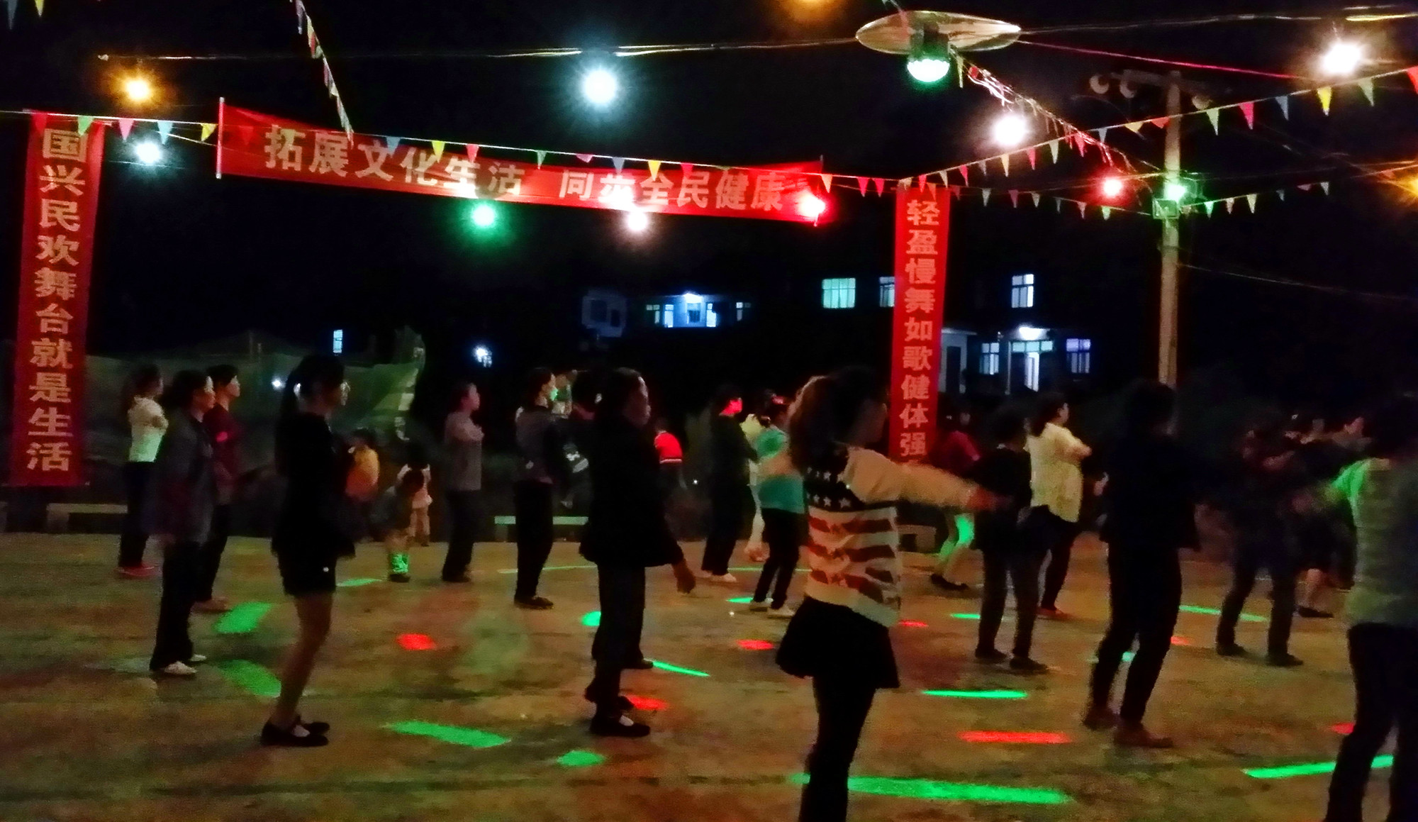 9月22晚,笔者随朋友一起赴大龙镇一心村现场参观村民广场舞。在如火如荼建设中的高铁城工地对面500米处,在百户温馨灯火闪耀的姚姓、刘姓村寨旁,有一面积约200余平方米的露天广场。广场水泥地面平整、四周装有长条石凳,上空彩带迎风飘扬,霓红灯闪烁不止。正前方悬挂着“拓展文化生活 同步全民健康”、左右两边分别挂着“国兴民欢舞台就是生活,轻盈慢舞如歌健体强身”的宣传标语,红底白字在夜幕里朦胧的灯光下显得格外醒目,广场音响正依次播放着《好日子》、《大地飞歌》、《美丽的大龙、腾飞的大龙》等,声色洪亮、音质清脆,音乐时而婉转悠扬、时而跌宕起伏。场上大约有百余村民正排着一列列整齐的队伍,舞动着曼妙的舞姿,挪动着轻盈的身姿,洋溢着甜甜的笑容,伴随着欢快的节奏、优美的旋律,和着情意浓浓的歌曲翩翩起舞。